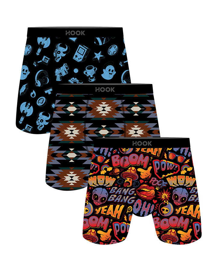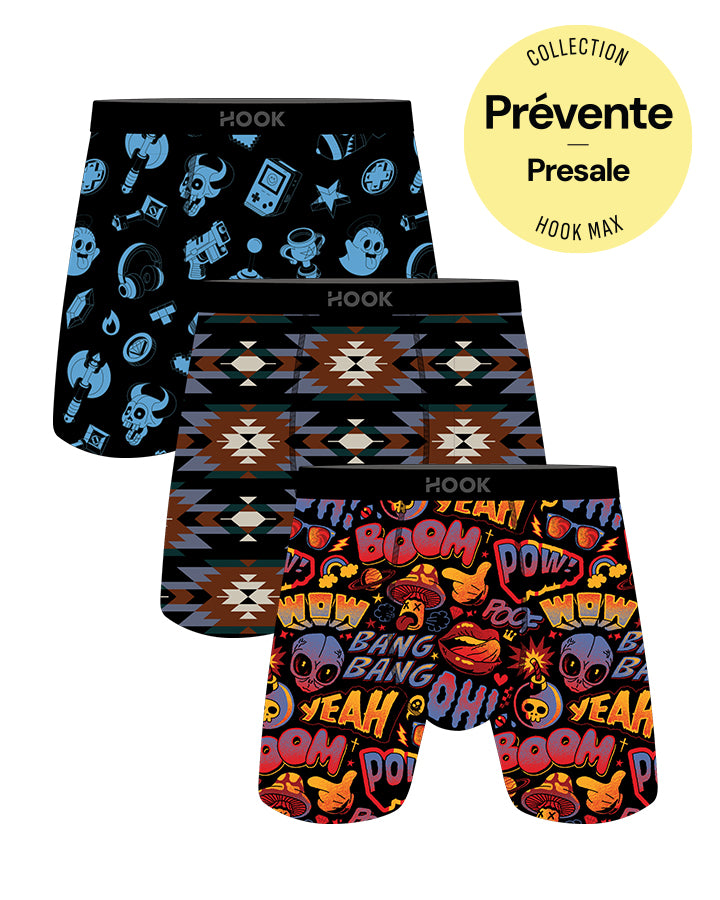 Le pack est composé de 3 magnifiques boxers des collection Max . Les 3 boxers seront 1X Aztek, 1X Pow et 1X Arcade