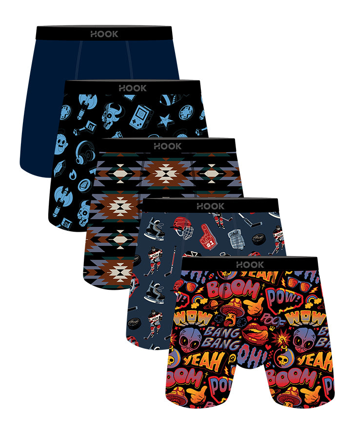 Le pack est composé de 5 magnifiques boxers des collection Max . Les 5 boxers seront 1X Tir au but, 1X Aztek, 1X Pow, 1X Arcade et 1X Bleu